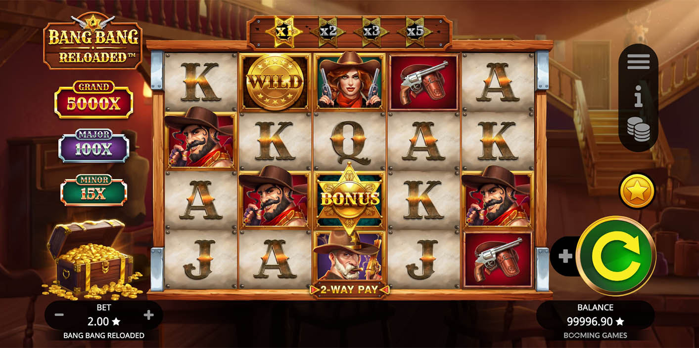 Bang Bang Reloaded by Booming Games is a high-energy Wild West slot that brings explosive action and rewarding mechanics to the reels. Set on a 5-reel, 4-row grid with 40 paylines, the game features cascading wins, progressive multipliers, and a bonus wheel that keeps the action fast-paced. With high volatility, an RTP of around 95.8%, and a top win potential of up to 5,200× your bet, Bang Bang Reloaded is built for players chasing big, dramatic payouts.
