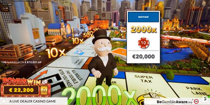 MONOPOLY Big Baller brings the iconic Monopoly board game to life in a vibrant live-casino setting. The studio is designed like a luxurious riverboat casino, filled with rich colours, polished wood textures, and glowing lights — perfectly matching the vintage Monopoly aesthetic. Mr. Monopoly himself appears throughout the game, adding charm by pulling levers, activating bonuses, and joining you on the bonus board.