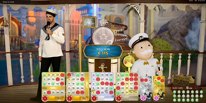 Evolution uses crisp animations and clean number overlays on the bingo cards, ensuring everything stays easy to read even during fast draws. The Bonus Board sequence is fully animated in 3D, with Mr. Monopoly walking around grabbing prizes, multipliers, and cash rewards — giving the bonus round a fun, cinematic feel.