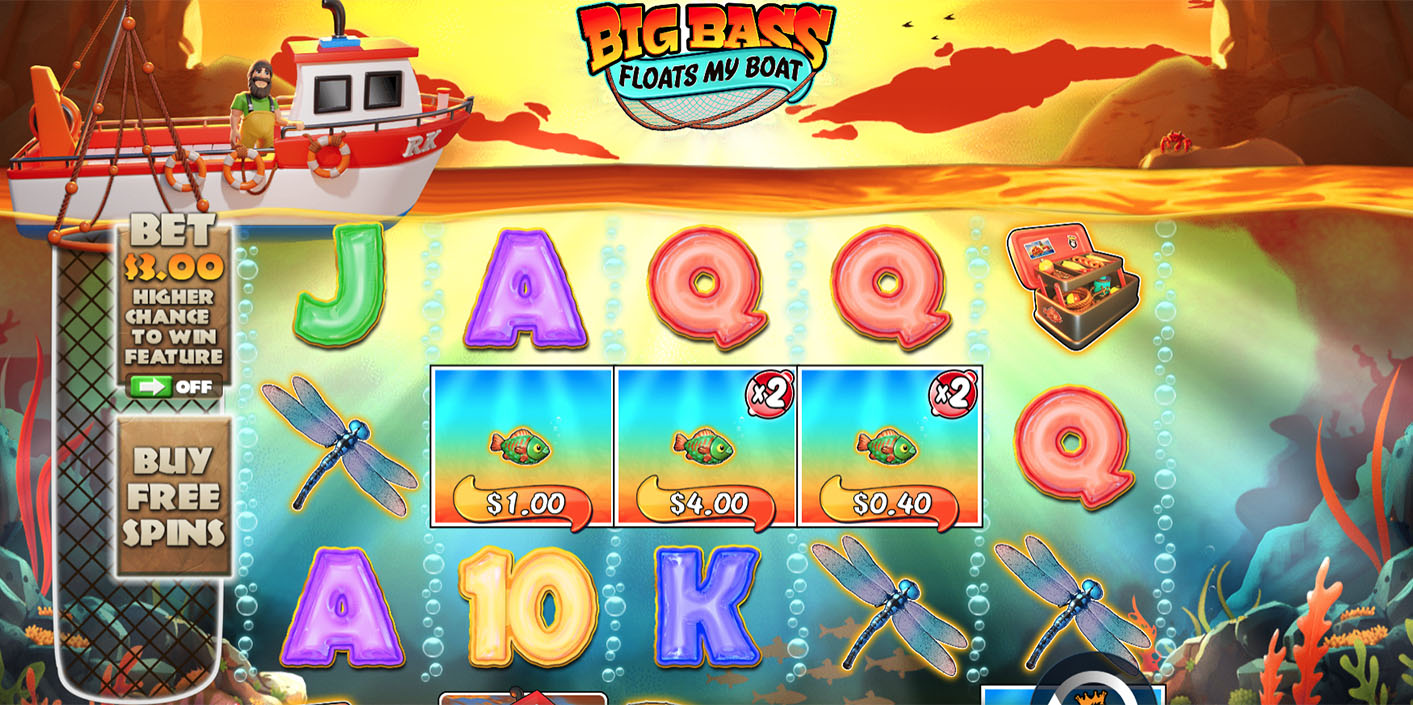 Big Bass Floats My Boat is played on a 5-reel, 3-row grid with traditional paylines. The base game builds anticipation through fish money symbols and occasional wild substitutions.